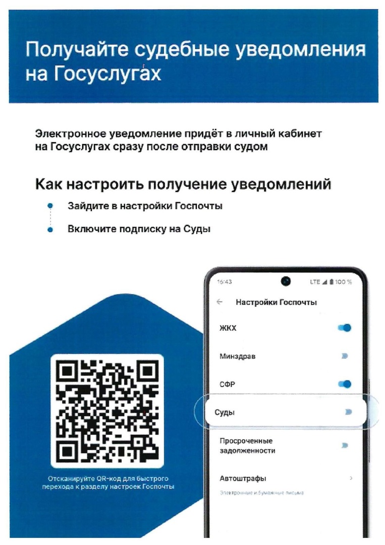 | Уважаемые граждане, напоминаем, что получать судебные уведомления в рамках рассмотрения гражданских и административных дел в районных (городских) судах и в Бутурлиновском районном суде Воронежской области максимально просто и удобно посредством Единого портала Госуслуг. Это позволяет сторонам судебного процесса моментально получать информацию о дате и времени судебного заседания. Кроме того, у гражданина, не подававшего заявлений в суд, есть возможность оперативно узнать, что к нему появились претензии от каких-либо лиц, обратившихся в судебной инстанцию. Для того, чтобы получать судебные уведомления на портале Госуслуг, необходимо в своем личном кабинете в разделе «настройки Госпочты» дать согласие (передвинуть бегунок вправо, в строке «суды») на получение судебных уведомлений. Инструкция по включению согласия на получение судебных уведомлений также имеется на портале государственных услуг. ✅Преимущества получения документов с портала Госуслуг: - моментальная доставка в личный кабинет; - судебная корреспонденция не теряется, она всегда доступна в электронной форме; - нет необходимости получать корреспонденцию в бумажном виде в отделении Почты России; - лицу, участвующему в деле, будет доставлено письмо в электронном виде даже при смене места жительства. |